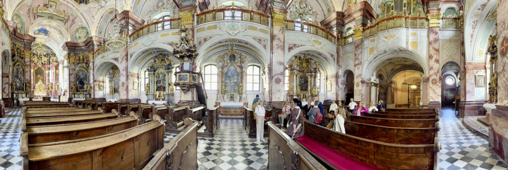 Auf die Minute pünktlich um 08:00 Uhr starteten wir unseren zweitägigen Ausflug, der als „Stiftsreise“ geplant worden war. Stift Vorau war unsere erste Station. Die Wartezeit bis zum Führungsbeginn füllten wir mit einer kurzfristig angesetzten Chorprobe – wir probten den „Zottelmarsch“ im ehrwürdigen Stiftshof. Wir wussten nicht, ob wir ihn am nächsten Tag vielleicht als Abschiedsgruß singen würden – beim Kirchweihfest in Maria Straßengel. Wir versuchten dabei unseren Regens zu überzeugen, dass er bei diesem Stück einmal so dirigieren müsse, wie WIR singen! Dann konzentrierten wir uns aber ganz auf die Geschichte von Stift Vorau, die uns der überaus kundige Führer näherbrachte. Nicht nur die Kirche, auch Sakristei und Bibliothek sind beeindruckend! Anschließend schlenderten wir gemütlich zum „Kutscherwirt“ gleich unterhalb des Stiftes. Gestärkt durch ein köstliches Mittagessen ging es weiter zum nächsten Genuss – zum „Lavabräu“ in Auersbach bei Feldbach. Gekonnt und fast so überzeugend wie ein Politiker weihte uns der Marketingmanager nicht nur in die Geheimnisse des Brauens ein, wir erfuhren auch Wissenswertes über das Whiskybrennen. Nach einem kurzen „Kaufrausch“ im Shop und der Fahrt durch die wunderschöne, üppig grüne Landschaft trafen wir leicht verspätet in unserem Hotel in Unterpremstätten ein. „Der Stockinger“ bietet zwar einen umfangreichen Wellness- und Fitnessbereich, wir zogen es aber vor, in fröhlicher Runde beisammenzusitzen, zu plaudern und zu singen – ausnahmsweise keine geistliche Musik! Angetrieben von unserer strengen Reiseleiterin fuhren wir Sonntagfrüh rechtzeitig ab, um in der Wallfahrtskirche „Maria Straßengel“ genügend Zeit zu haben für Margit, um die Orgel zu probieren, und für uns, um die Chorstücke noch kurz zu proben. Zur Gottesdienstgestaltung sagen wir die „Missa Quinta in B“ von V. E. Horak, sowie Werke von Buxtehude, Telemann, Arcadelt und Rimskij-Korsakov (Vater unser) und natürlich das „Ave verum“. Nur schwer trennten wir uns von der Kirche, diesem hochgotischen Kleinod, und den freundlichen Menschen – der „Zottelmarsch“ war nicht gefordert worden –, um zum nächsten Highlight unserer Reise zu fahren. Stift Rein, das weltälteste Zisterzienserstift war Ziel und Schlusspunkt unserer „Stiftsreise“. Die launige und überaus kundige Führung durch Kirche und Stiftsgebäude war ein schöner Abschluss unserer Reise. Besonders von der Bibliothek konnten wir uns nur schwer trennen. Der musikalische Schlusspunkt war das „Ave verum“, das wir in der Kirche hoch oben auf dem Chor spontan sangen.
